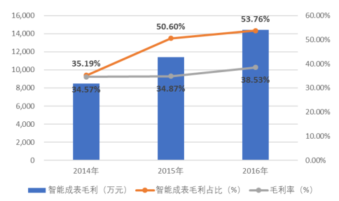 從毛利的角度看,智能成表的毛利占比迅速提升,從14至16年的毛利占比分別為35.19%、50.6%和53.76%,成為毛利主要來源。